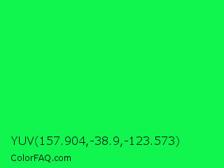 YUV 157.904,-38.9,-123.573 Color is a normal green color and the nearest color is Malachite #0bda51. Hex code #11f54f and RGB value is rgb(17,245,79). In RGB color space, this color is composed of 7% red, 96% green, 31% blue, In CMYK color space, this color is composed of 93% cyan, 0% magenta, 68% yellow , 4% black , In HSL color space, this color has a hue angle of 136° , 92% saturation and 51% lightness.
