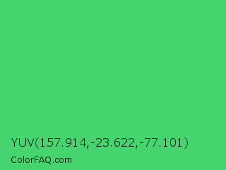 YUV 157.914,-23.622,-77.101 Color is a normal green color and the nearest color is UFO Green #3cd070. Hex code #46d46e and RGB value is rgb(70,212,110). In RGB color space, this color is composed of 27% red, 83% green, 43% blue, In CMYK color space, this color is composed of 67% cyan, 0% magenta, 48% yellow , 17% black , In HSL color space, this color has a hue angle of 137° , 62% saturation and 55% lightness.