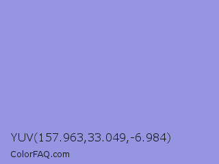 YUV 157.963,33.049,-6.984 Color is a light indigo color and the nearest color is Dull Lavender #a899e6. Hex code #9695e1 and RGB value is rgb(150,149,225). In RGB color space, this color is composed of 59% red, 58% green, 88% blue, In CMYK color space, this color is composed of 33% cyan, 34% magenta, 0% yellow , 12% black , In HSL color space, this color has a hue angle of 241° , 56% saturation and 73% lightness.