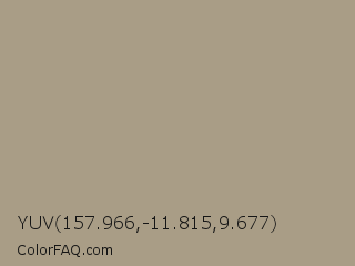 YUV 157.966,-11.815,9.677 Color is a normal orange color and the nearest color is Grullo #a99a86. Hex code #a99d86 and RGB value is rgb(169,157,134). In RGB color space, this color is composed of 66% red, 62% green, 53% blue, In CMYK color space, this color is composed of 0% cyan, 7% magenta, 21% yellow , 34% black , In HSL color space, this color has a hue angle of 39° , 17% saturation and 59% lightness.