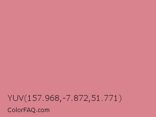 YUV 157.968,-7.872,51.771 Color is a light red color and the nearest color is Shimmering Blush #d98695. Hex code #d9838e and RGB value is rgb(217,131,142). In RGB color space, this color is composed of 85% red, 51% green, 56% blue, In CMYK color space, this color is composed of 0% cyan, 40% magenta, 35% yellow , 15% black , In HSL color space, this color has a hue angle of 352° , 53% saturation and 68% lightness.