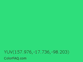 YUV 157.976,-17.736,-98.203 Color is a normal green color and the nearest color is UFO Green #3cd070. Hex code #2ede7a and RGB value is rgb(46,222,122). In RGB color space, this color is composed of 18% red, 87% green, 48% blue, In CMYK color space, this color is composed of 79% cyan, 0% magenta, 45% yellow , 13% black , In HSL color space, this color has a hue angle of 146° , 73% saturation and 53% lightness.