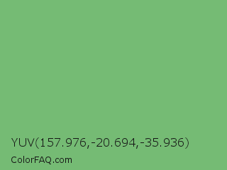 YUV 157.976,-20.694,-35.936 Color is a normal green color and the nearest color is Iguana Green #71bc78. Hex code #75bb74 and RGB value is rgb(117,187,116). In RGB color space, this color is composed of 46% red, 73% green, 45% blue, In CMYK color space, this color is composed of 37% cyan, 0% magenta, 38% yellow , 27% black , In HSL color space, this color has a hue angle of 119° , 34% saturation and 59% lightness.