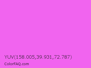 YUV 158.005,39.931,72.787 Color is a light magenta color and the nearest color is Pink Flamingo Crayola #ff66ff. Hex code #f164ef and RGB value is rgb(241,100,239). In RGB color space, this color is composed of 95% red, 39% green, 94% blue, In CMYK color space, this color is composed of 0% cyan, 59% magenta, 1% yellow , 5% black , In HSL color space, this color has a hue angle of 301° , 83% saturation and 67% lightness.
