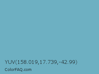 YUV 158.019,17.739,-42.99 Color is a normal cyan color and the nearest color is Moonstone Blue #73a9c2. Hex code #6db0c2 and RGB value is rgb(109,176,194). In RGB color space, this color is composed of 43% red, 69% green, 76% blue, In CMYK color space, this color is composed of 44% cyan, 9% magenta, 0% yellow , 24% black , In HSL color space, this color has a hue angle of 193° , 41% saturation and 59% lightness.