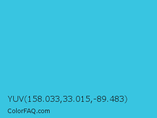 YUV 158.033,33.015,-89.483 Color is a normal cyan color and the nearest color is Scooter #2ebfd4. Hex code #38c5e1 and RGB value is rgb(56,197,225). In RGB color space, this color is composed of 22% red, 77% green, 88% blue, In CMYK color space, this color is composed of 75% cyan, 12% magenta, 0% yellow , 12% black , In HSL color space, this color has a hue angle of 190° , 74% saturation and 55% lightness.