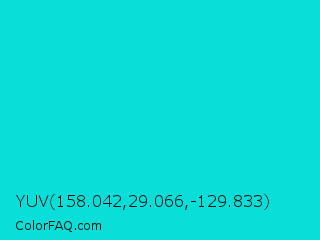 YUV 158.042,29.066,-129.833 Color is a normal cyan color and the nearest color is Bright Turquoise #08e8de. Hex code #0aded9 and RGB value is rgb(10,222,217). In RGB color space, this color is composed of 4% red, 87% green, 85% blue, In CMYK color space, this color is composed of 95% cyan, 0% magenta, 2% yellow , 13% black , In HSL color space, this color has a hue angle of 179° , 91% saturation and 45% lightness.