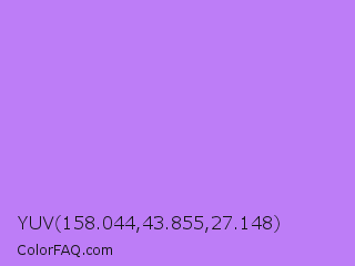 YUV 158.044,43.855,27.148 Color is a light purple color and the nearest color is Lavender #b57edc. Hex code #bd7df7 and RGB value is rgb(189,125,247). In RGB color space, this color is composed of 74% red, 49% green, 97% blue, In CMYK color space, this color is composed of 23% cyan, 49% magenta, 0% yellow , 3% black , In HSL color space, this color has a hue angle of 271° , 88% saturation and 73% lightness.