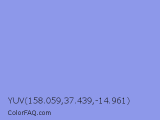 YUV 158.059,37.439,-14.961 Color is a light blue color and the nearest color is Portage #8b9fee. Hex code #8d98ea and RGB value is rgb(141,152,234). In RGB color space, this color is composed of 55% red, 60% green, 92% blue, In CMYK color space, this color is composed of 40% cyan, 35% magenta, 0% yellow , 8% black , In HSL color space, this color has a hue angle of 233° , 69% saturation and 74% lightness.