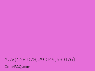 YUV 158.078,29.049,63.076 Color is a light magenta color and the nearest color is Orchid #da70d6. Hex code #e66ed9 and RGB value is rgb(230,110,217). In RGB color space, this color is composed of 90% red, 43% green, 85% blue, In CMYK color space, this color is composed of 0% cyan, 52% magenta, 6% yellow , 10% black , In HSL color space, this color has a hue angle of 307° , 71% saturation and 67% lightness.