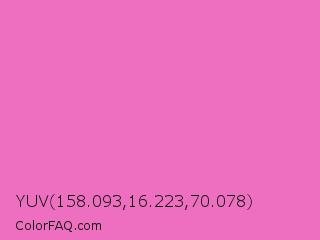 YUV 158.093,16.223,70.078 Color is a light magenta color and the nearest color is Persian Pink #f77fbe. Hex code #ee6fbf and RGB value is rgb(238,111,191). In RGB color space, this color is composed of 93% red, 44% green, 75% blue, In CMYK color space, this color is composed of 0% cyan, 53% magenta, 20% yellow , 7% black , In HSL color space, this color has a hue angle of 322° , 79% saturation and 68% lightness.