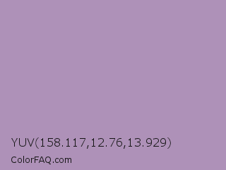 YUV 158.117,12.76,13.929 Color is a light purple color and the nearest color is Glossy Grape #ab92b3. Hex code #ae91b8 and RGB value is rgb(174,145,184). In RGB color space, this color is composed of 68% red, 57% green, 72% blue, In CMYK color space, this color is composed of 5% cyan, 21% magenta, 0% yellow , 28% black , In HSL color space, this color has a hue angle of 285° , 22% saturation and 65% lightness.
