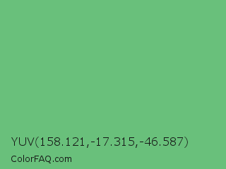 YUV 158.121,-17.315,-46.587 Color is a normal green color and the nearest color is Iguana Green #71bc78. Hex code #69c07b and RGB value is rgb(105,192,123). In RGB color space, this color is composed of 41% red, 75% green, 48% blue, In CMYK color space, this color is composed of 45% cyan, 0% magenta, 36% yellow , 25% black , In HSL color space, this color has a hue angle of 132° , 41% saturation and 58% lightness.