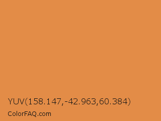 YUV 158.147,-42.963,60.384 Color is a normal orange color and the nearest color is Tigers Eye #e08d3c. Hex code #e38c47 and RGB value is rgb(227,140,71). In RGB color space, this color is composed of 89% red, 55% green, 28% blue, In CMYK color space, this color is composed of 0% cyan, 38% magenta, 69% yellow , 11% black , In HSL color space, this color has a hue angle of 27° , 74% saturation and 58% lightness.