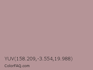 YUV 158.209,-3.554,19.988 Color is a light red color and the nearest color is Del Rio #b09a95. Hex code #b59497 and RGB value is rgb(181,148,151). In RGB color space, this color is composed of 71% red, 58% green, 59% blue, In CMYK color space, this color is composed of 0% cyan, 18% magenta, 17% yellow , 29% black , In HSL color space, this color has a hue angle of 355° , 18% saturation and 65% lightness.
