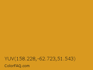 YUV 158.228,-62.723,51.543 Color is a normal orange color and the nearest color is Golden Grass #daa520. Hex code #d9991f and RGB value is rgb(217,153,31). In RGB color space, this color is composed of 85% red, 60% green, 12% blue, In CMYK color space, this color is composed of 0% cyan, 29% magenta, 86% yellow , 15% black , In HSL color space, this color has a hue angle of 39° , 75% saturation and 49% lightness.