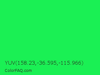 YUV 158.23,-36.595,-115.966 Color is a normal green color and the nearest color is Malachite #0bda51. Hex code #1af054 and RGB value is rgb(26,240,84). In RGB color space, this color is composed of 10% red, 94% green, 33% blue, In CMYK color space, this color is composed of 89% cyan, 0% magenta, 65% yellow , 6% black , In HSL color space, this color has a hue angle of 136° , 88% saturation and 52% lightness.