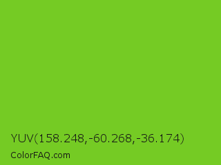YUV 158.248,-60.268,-36.174 Color is a normal green color and the nearest color is Lima #76bd17. Hex code #75cb24 and RGB value is rgb(117,203,36). In RGB color space, this color is composed of 46% red, 80% green, 14% blue, In CMYK color space, this color is composed of 42% cyan, 0% magenta, 82% yellow , 20% black , In HSL color space, this color has a hue angle of 91° , 70% saturation and 47% lightness.