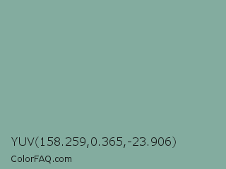 YUV 158.259,0.365,-23.906 Color is a normal green color and the nearest color is Acapulco #7cb0a1. Hex code #83ac9f and RGB value is rgb(131,172,159). In RGB color space, this color is composed of 51% red, 67% green, 62% blue, In CMYK color space, this color is composed of 24% cyan, 0% magenta, 8% yellow , 33% black , In HSL color space, this color has a hue angle of 161° , 20% saturation and 59% lightness.