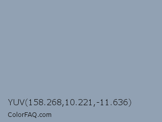YUV 158.268,10.221,-11.636 Color is a light blue color and the nearest color is Cadet Grey #91a3b0. Hex code #91a1b3 and RGB value is rgb(145,161,179). In RGB color space, this color is composed of 57% red, 63% green, 70% blue, In CMYK color space, this color is composed of 19% cyan, 10% magenta, 0% yellow , 30% black , In HSL color space, this color has a hue angle of 212° , 18% saturation and 64% lightness.