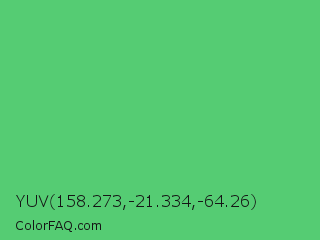YUV 158.273,-21.334,-64.26 Color is a normal green color and the nearest color is Emerald #50c878. Hex code #55cc73 and RGB value is rgb(85,204,115). In RGB color space, this color is composed of 33% red, 80% green, 45% blue, In CMYK color space, this color is composed of 58% cyan, 0% magenta, 44% yellow , 20% black , In HSL color space, this color has a hue angle of 135° , 54% saturation and 57% lightness.