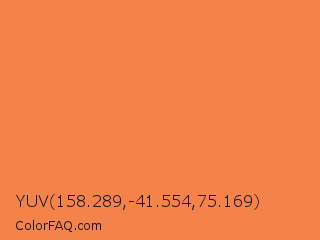YUV 158.289,-41.554,75.169 Color is a light orange color and the nearest color is Mandarin #f37a48. Hex code #f4834a and RGB value is rgb(244,131,74). In RGB color space, this color is composed of 96% red, 51% green, 29% blue, In CMYK color space, this color is composed of 0% cyan, 46% magenta, 70% yellow , 4% black , In HSL color space, this color has a hue angle of 20° , 89% saturation and 62% lightness.