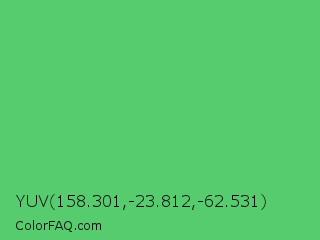 YUV 158.301,-23.812,-62.531 Color is a normal green color and the nearest color is Emerald #50c878. Hex code #57cc6e and RGB value is rgb(87,204,110). In RGB color space, this color is composed of 34% red, 80% green, 43% blue, In CMYK color space, this color is composed of 57% cyan, 0% magenta, 46% yellow , 20% black , In HSL color space, this color has a hue angle of 132° , 53% saturation and 57% lightness.