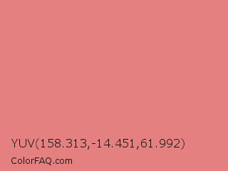 YUV 158.313,-14.451,61.992 Color is a light red color and the nearest color is Light Coral #f08080. Hex code #e58081 and RGB value is rgb(229,128,129). In RGB color space, this color is composed of 90% red, 50% green, 51% blue, In CMYK color space, this color is composed of 0% cyan, 44% magenta, 44% yellow , 10% black , In HSL color space, this color has a hue angle of 359° , 66% saturation and 70% lightness.