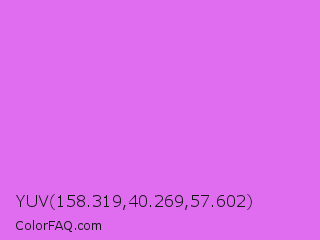 YUV 158.319,40.269,57.602 Color is a light magenta color and the nearest color is Heliotrope #df73ff. Hex code #e06df0 and RGB value is rgb(224,109,240). In RGB color space, this color is composed of 88% red, 43% green, 94% blue, In CMYK color space, this color is composed of 7% cyan, 55% magenta, 0% yellow , 6% black , In HSL color space, this color has a hue angle of 293° , 81% saturation and 68% lightness.
