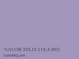 YUV 158.333,15.119,4.093 Color is a light indigo color and the nearest color is Amethyst Smoke #a397b4. Hex code #a396bd and RGB value is rgb(163,150,189). In RGB color space, this color is composed of 64% red, 59% green, 74% blue, In CMYK color space, this color is composed of 14% cyan, 21% magenta, 0% yellow , 26% black , In HSL color space, this color has a hue angle of 260° , 23% saturation and 66% lightness.