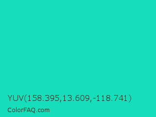 YUV 158.395,13.609,-118.741 Color is a normal cyan color and the nearest color is Turquoise PWG #30d5c8. Hex code #17deba and RGB value is rgb(23,222,186). In RGB color space, this color is composed of 9% red, 87% green, 73% blue, In CMYK color space, this color is composed of 90% cyan, 0% magenta, 16% yellow , 13% black , In HSL color space, this color has a hue angle of 169° , 81% saturation and 48% lightness.
