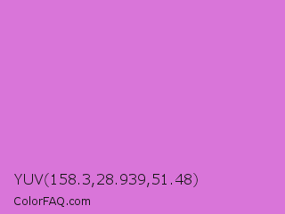 YUV 158.3,28.939,51.48 Color is a light magenta color and the nearest color is Orchid #da70d6. Hex code #d975d9 and RGB value is rgb(217,117,217). In RGB color space, this color is composed of 85% red, 46% green, 85% blue, In CMYK color space, this color is composed of 0% cyan, 46% magenta, 0% yellow , 15% black , In HSL color space, this color has a hue angle of 300° , 57% saturation and 65% lightness.