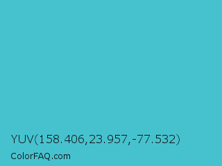 YUV 158.406,23.957,-77.532 Color is a normal cyan color and the nearest color is Sea Serpent #4bc7cf. Hex code #46c2cf and RGB value is rgb(70,194,207). In RGB color space, this color is composed of 27% red, 76% green, 81% blue, In CMYK color space, this color is composed of 66% cyan, 6% magenta, 0% yellow , 19% black , In HSL color space, this color has a hue angle of 186° , 59% saturation and 54% lightness.