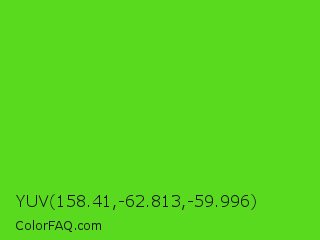 YUV 158.41,-62.813,-59.996 Color is a normal green color and the nearest color is Harlequin Green #46cb18. Hex code #5ada1f and RGB value is rgb(90,218,31). In RGB color space, this color is composed of 35% red, 85% green, 12% blue, In CMYK color space, this color is composed of 59% cyan, 0% magenta, 86% yellow , 15% black , In HSL color space, this color has a hue angle of 101° , 75% saturation and 49% lightness.