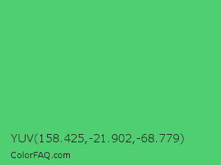 YUV 158.425,-21.902,-68.779 Color is a normal green color and the nearest color is Emerald #50c878. Hex code #50cf72 and RGB value is rgb(80,207,114). In RGB color space, this color is composed of 31% red, 81% green, 45% blue, In CMYK color space, this color is composed of 61% cyan, 0% magenta, 45% yellow , 19% black , In HSL color space, this color has a hue angle of 136° , 57% saturation and 56% lightness.