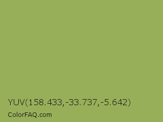 YUV 158.433,-33.737,-5.642 Color is a normal lime color and the nearest color is Chelsea Cucumber #83aa5d. Hex code #98af5a and RGB value is rgb(152,175,90). In RGB color space, this color is composed of 60% red, 69% green, 35% blue, In CMYK color space, this color is composed of 13% cyan, 0% magenta, 49% yellow , 31% black , In HSL color space, this color has a hue angle of 76° , 35% saturation and 52% lightness.