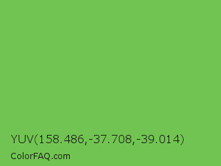 YUV 158.486,-37.708,-39.014 Color is a normal green color and the nearest color is Mantis #74c365. Hex code #72c452 and RGB value is rgb(114,196,82). In RGB color space, this color is composed of 45% red, 77% green, 32% blue, In CMYK color space, this color is composed of 42% cyan, 0% magenta, 58% yellow , 23% black , In HSL color space, this color has a hue angle of 103° , 49% saturation and 55% lightness.