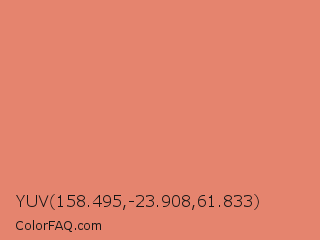 YUV 158.495,-23.908,61.833 Color is a light red color and the nearest color is Middle Red #e58e73. Hex code #e5846e and RGB value is rgb(229,132,110). In RGB color space, this color is composed of 90% red, 52% green, 43% blue, In CMYK color space, this color is composed of 0% cyan, 42% magenta, 52% yellow , 10% black , In HSL color space, this color has a hue angle of 11° , 70% saturation and 66% lightness.
