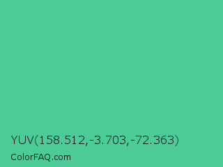YUV 158.512,-3.703,-72.363 Color is a normal green color and the nearest color is Ocean Green #48bf91. Hex code #4cca97 and RGB value is rgb(76,202,151). In RGB color space, this color is composed of 30% red, 79% green, 59% blue, In CMYK color space, this color is composed of 62% cyan, 0% magenta, 25% yellow , 21% black , In HSL color space, this color has a hue angle of 156° , 54% saturation and 55% lightness.