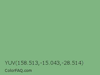 YUV 158.513,-15.043,-28.514 Color is a normal green color and the nearest color is Iguana Green #71bc78. Hex code #7eb580 and RGB value is rgb(126,181,128). In RGB color space, this color is composed of 49% red, 71% green, 50% blue, In CMYK color space, this color is composed of 30% cyan, 0% magenta, 29% yellow , 29% black , In HSL color space, this color has a hue angle of 122° , 27% saturation and 60% lightness.