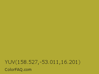 YUV 158.527,-53.011,16.201 Color is a normal yellow color and the nearest color is Brass #b5a642. Hex code #b1aa33 and RGB value is rgb(177,170,51). In RGB color space, this color is composed of 69% red, 67% green, 20% blue, In CMYK color space, this color is composed of 0% cyan, 4% magenta, 71% yellow , 31% black , In HSL color space, this color has a hue angle of 57° , 55% saturation and 45% lightness.