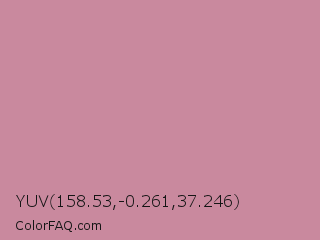 YUV 158.53,-0.261,37.246 Color is a light rose color and the nearest color is Puce #cc8899. Hex code #c9899e and RGB value is rgb(201,137,158). In RGB color space, this color is composed of 79% red, 54% green, 62% blue, In CMYK color space, this color is composed of 0% cyan, 32% magenta, 21% yellow , 21% black , In HSL color space, this color has a hue angle of 340° , 37% saturation and 66% lightness.