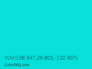 YUV 158.547,29.803,-132.907 Color is a normal cyan color and the nearest color is Bright Turquoise #08e8de. Hex code #07e0db and RGB value is rgb(7,224,219). In RGB color space, this color is composed of 3% red, 88% green, 86% blue, In CMYK color space, this color is composed of 97% cyan, 0% magenta, 2% yellow , 12% black , In HSL color space, this color has a hue angle of 179° , 94% saturation and 45% lightness.