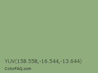 YUV 158.558,-16.544,-13.644 Color is a normal green color and the nearest color is Olivine #9ab973. Hex code #8fad7d and RGB value is rgb(143,173,125). In RGB color space, this color is composed of 56% red, 68% green, 49% blue, In CMYK color space, this color is composed of 17% cyan, 0% magenta, 28% yellow , 32% black , In HSL color space, this color has a hue angle of 98° , 23% saturation and 58% lightness.