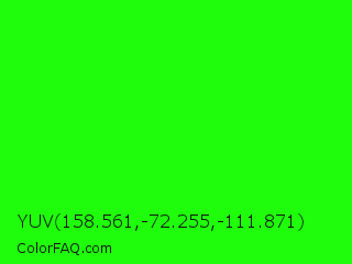 YUV 158.561,-72.255,-111.871 Color is a normal green color and the nearest color is Neon Green #39ff14. Hex code #1ffc0c and RGB value is rgb(31,252,12). In RGB color space, this color is composed of 12% red, 99% green, 5% blue, In CMYK color space, this color is composed of 88% cyan, 0% magenta, 95% yellow , 1% black , In HSL color space, this color has a hue angle of 115° , 98% saturation and 52% lightness.