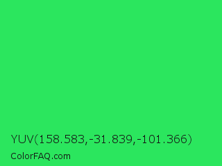 YUV 158.583,-31.839,-101.366 Color is a normal green color and the nearest color is UFO Green #3cd070. Hex code #2be65e and RGB value is rgb(43,230,94). In RGB color space, this color is composed of 17% red, 90% green, 37% blue, In CMYK color space, this color is composed of 81% cyan, 0% magenta, 59% yellow , 10% black , In HSL color space, this color has a hue angle of 136° , 79% saturation and 54% lightness.