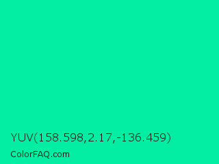 YUV 158.598,2.17,-136.459 Color is a normal green color and the nearest color is Medium Spring Green #00fa9a. Hex code #03eda3 and RGB value is rgb(3,237,163). In RGB color space, this color is composed of 1% red, 93% green, 64% blue, In CMYK color space, this color is composed of 99% cyan, 0% magenta, 31% yellow , 7% black , In HSL color space, this color has a hue angle of 161° , 98% saturation and 47% lightness.