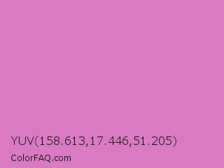 YUV 158.613,17.446,51.205 Color is a light magenta color and the nearest color is Middle Purple #d982b5. Hex code #d97ac2 and RGB value is rgb(217,122,194). In RGB color space, this color is composed of 85% red, 48% green, 76% blue, In CMYK color space, this color is composed of 0% cyan, 44% magenta, 11% yellow , 15% black , In HSL color space, this color has a hue angle of 315° , 56% saturation and 66% lightness.
