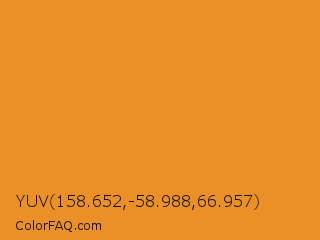 YUV 158.652,-58.988,66.957 Color is a normal orange color and the nearest color is Carrot Orange #ed9121. Hex code #eb8f27 and RGB value is rgb(235,143,39). In RGB color space, this color is composed of 92% red, 56% green, 15% blue, In CMYK color space, this color is composed of 0% cyan, 39% magenta, 83% yellow , 8% black , In HSL color space, this color has a hue angle of 32° , 83% saturation and 54% lightness.