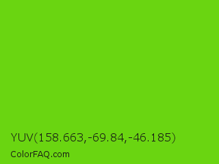 YUV 158.663,-69.84,-46.185 Color is a normal green color and the nearest color is Lima #76bd17. Hex code #6ad511 and RGB value is rgb(106,213,17). In RGB color space, this color is composed of 42% red, 84% green, 7% blue, In CMYK color space, this color is composed of 50% cyan, 0% magenta, 92% yellow , 16% black , In HSL color space, this color has a hue angle of 93° , 85% saturation and 45% lightness.